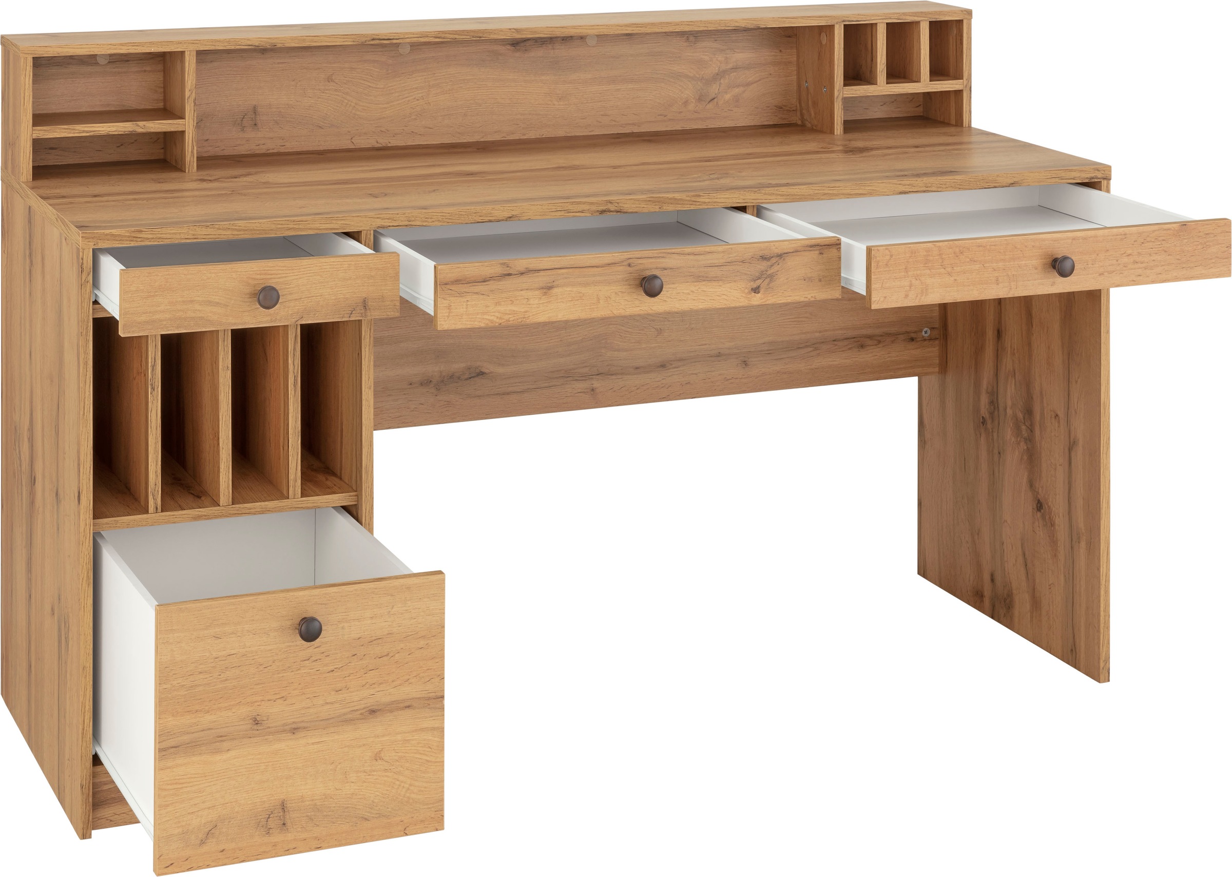 Die großzügige arbeitsplatte wird durch einen dekorativen aufbau erweitert, der dir elf zusätzliche utensilienfächer und ablagen zur verfügung stellt.
